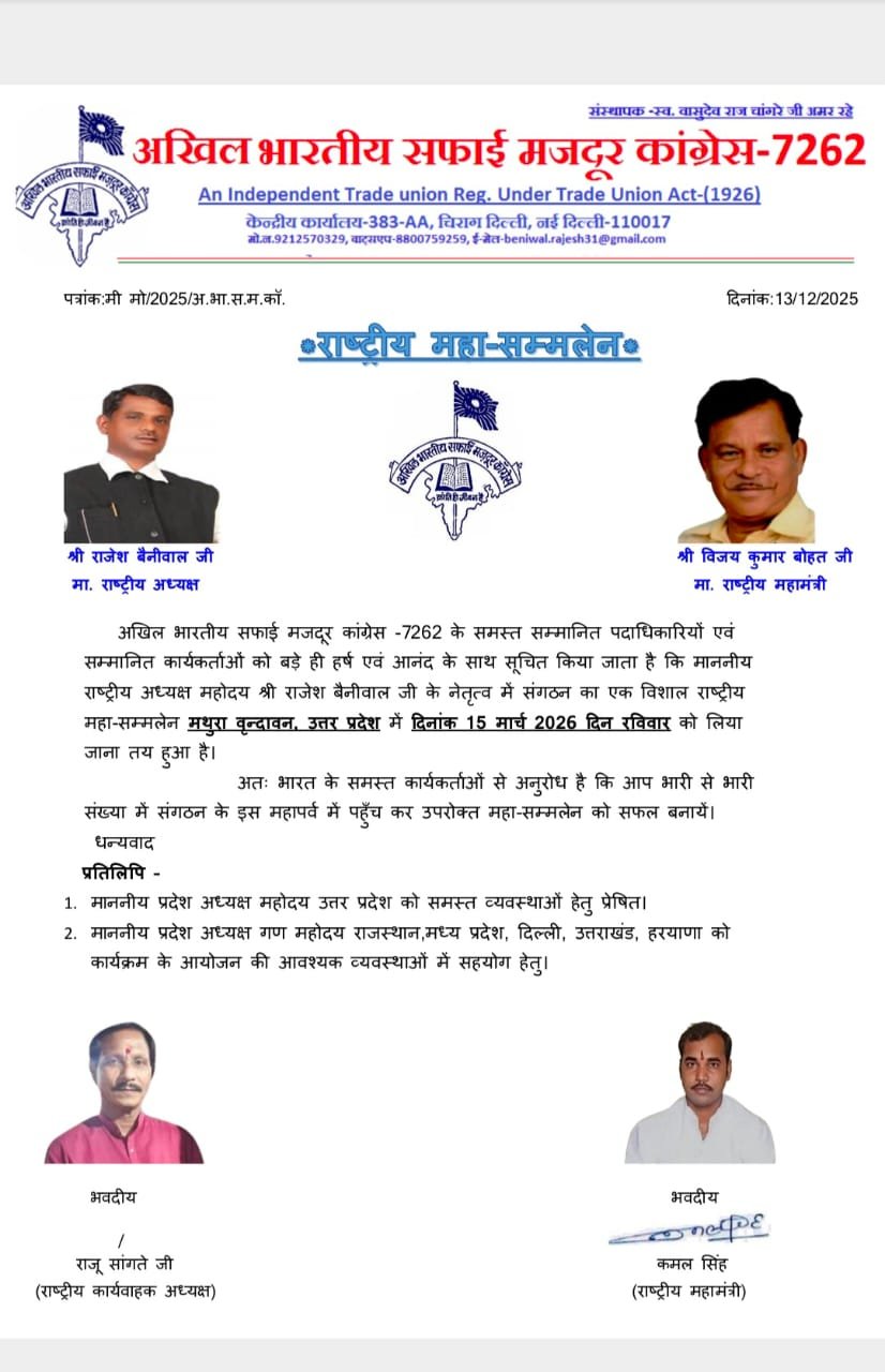 अखिल भारतीय सफाई मजदूर कांग्रेस -7262 का राष्ट्रीय अधिवेशन मथुरा वृन्दावन उत्तर प्रदेश में आयोजित किया गया है जिसमें ज्यादा से ज्यादा संख्या में पहुँच कर कार्क्रम की शोभा बढ़ाएं